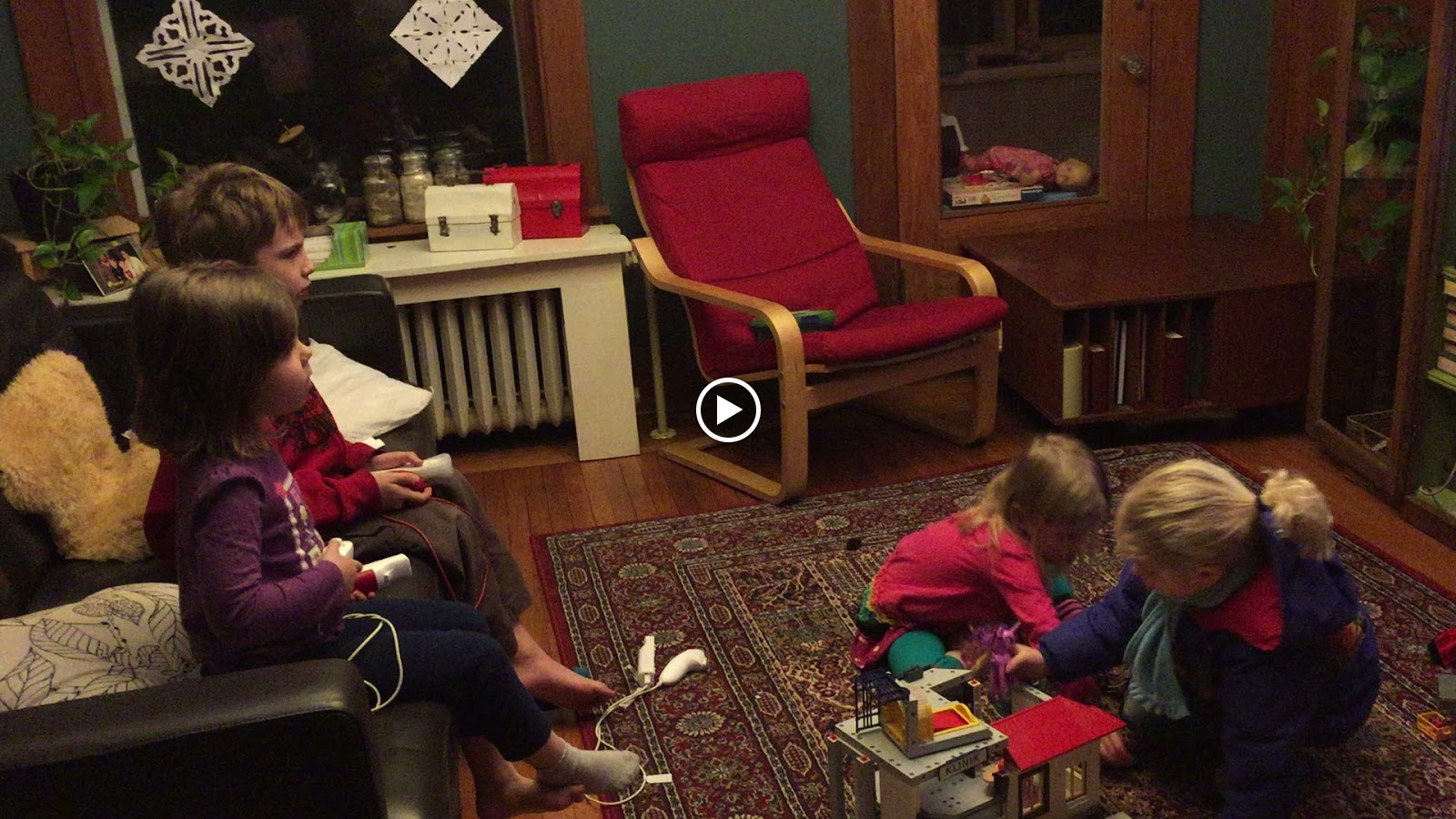 Last night the girls drifted back and forth between video games and Playmobil and for quite a while our living room looked like this, with everything happening at once. The grownups sat in the other room and played Set and talked. I can't believe how big and independent these children have become.