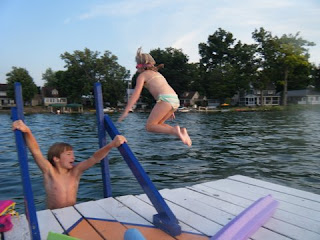 Vacation this year-- it has been SO good. So...vacation-ey. We have just sunk in to the relaxation, the routine of boating and swimming and sitting in the lake breezes. The relaxation has been compounded by the fact that our parenting duties have been rather minimal. This summer our children have been truly Farley's free-range kids, disappearing for large portions of the day to other cottages, the park, the lake... leaving us to sit and chat with family and neighbors and one another-- or ignore each other and get some schoolwork done... or ignore the schoolwork and read instead. Jack is an independent swimmer, easily passing his "raft test" and swimming with cousins and friends for hours, diving beautifully (though he noted to his cousins, "I'm not consistent yet with my perfect dives..." ) -- when he is not playing Singing Monsters and Castle Clash on his Kindle, that is. Ivy has become part of an inseparable trio with next door neighbor Reese and cousin Izzy, and these three 6 year olds are ready to take on the world. Or at least, play a LOT of littlest pet shop, swing and climb at the park, and mercilessly shadow the troupe of "big girls" (a cadre of pre-teens who are remarkably patient with the little ones). She has been included on numerous boat rides with Barb and the Koons and she is confident jumping off a boat to swim in the middle of the lake. Her favorite spot to ride in the fast boats-- right in the front of the bow, leaning forward into the wind. My girl. The kids are barefoot ALL the time and in bathing suits about 90% of the time and they are long and lean and tan and blonde and so independent. I always feel like they grow up in triple time while we are here.